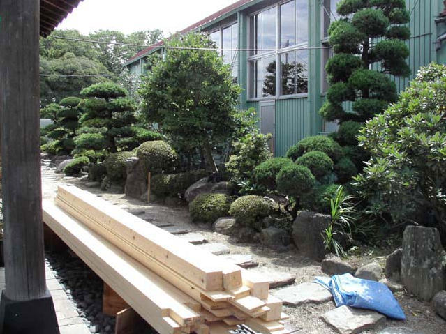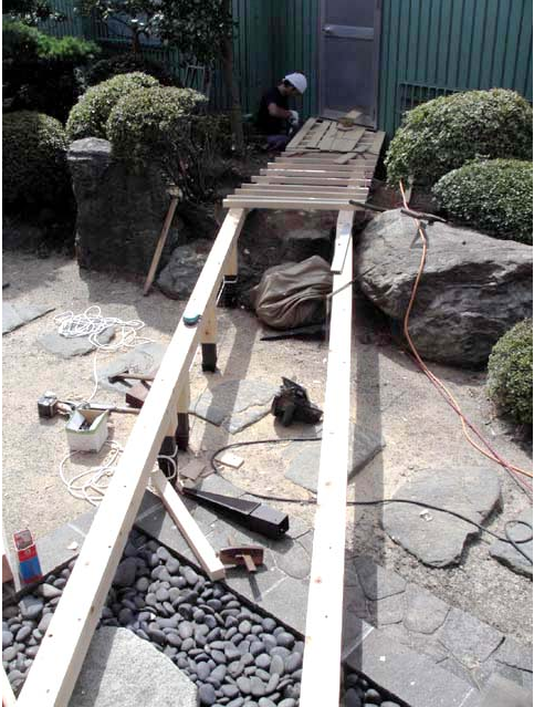 作業写真。庭の植栽を移植し、廊下が設置できるようにしてから、作業してます。