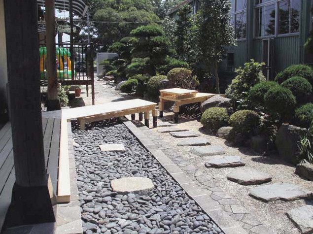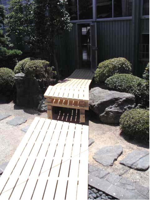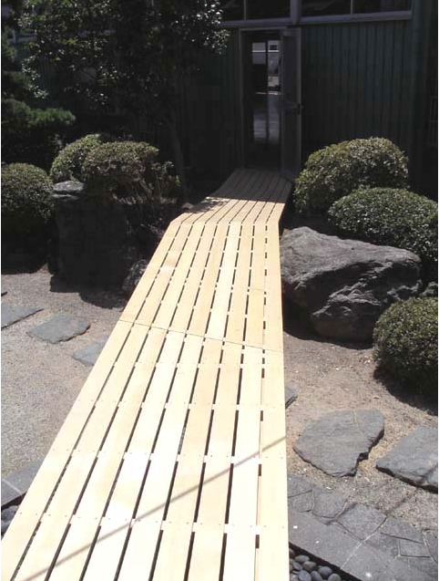 完成写真。ヒバ材を使用しているので見た目も美しく、耐久性もあります。廊下途中部分では、床の一部が外れるようになっており、通行の邪魔にもならない配慮をしています。