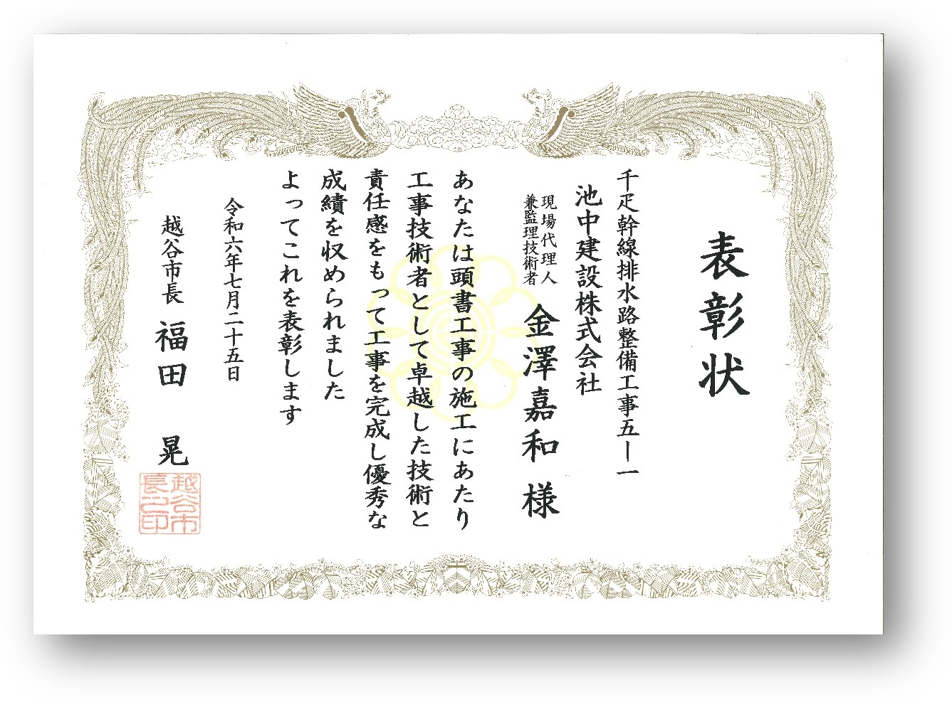 【令和6年7月 越谷市から工事技術者表彰を受賞しました】 2024年7月25日 Author: wpmaster Category: お知らせ 令和6年7月25日 越谷市役で令和6年度優秀建設工事(工事技術者)表彰が行われました。 《工事名 千疋幹線排水路整備工事5-1》