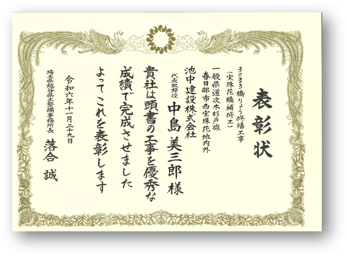 【令和6年11月 埼玉県越谷県土整備事務所から施工者表彰を受賞しました】 2024年11月29日 Author: wpmaster Category: お知らせ 令和6年11月29日 埼玉県県土整備事務所で令和6年度表彰式が行われました。 《工事名 3033橋りょう修繕工事(宝珠花橋補修工)》