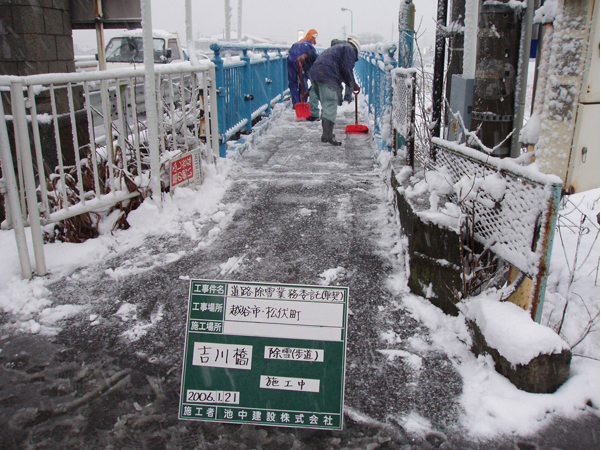 【除雪】 越谷市・県・警察と連携し、降雪時に橋の上の除雪及び融雪材(塩化カルシウム)の散布を行っています。特に融雪材の散布は、路面凍結防止のため夜中も行います。 (写真は午前2時30分頃) |