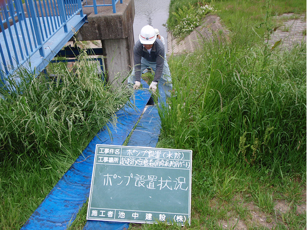 【水防活動】 越谷市・県・警察と連携し、台風などで大雨が降ると冠水する箇所に、事前に排水ポンプを設置します。 運転とパトロール等は夜中も行います。また、冠水した箇所をバリケードで封鎖したり、土のうを積んで浸水を防いだりします。 |